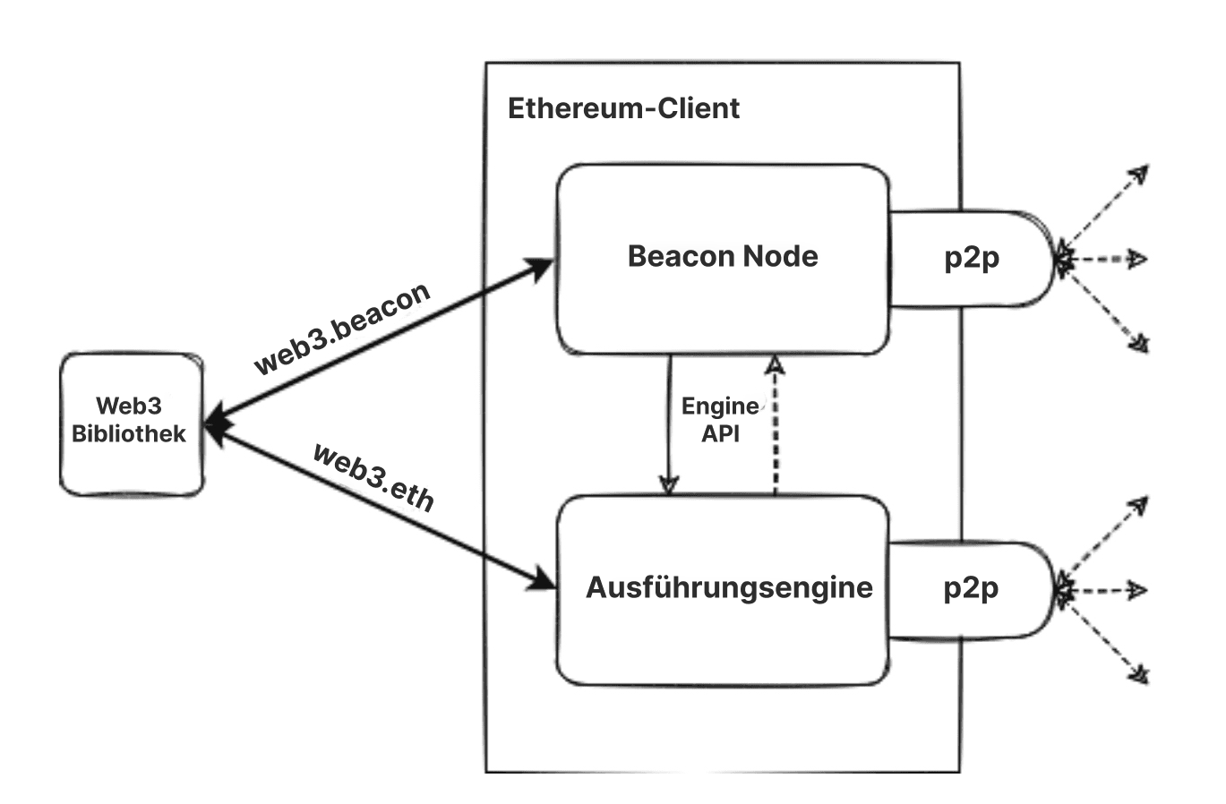 Diese Clients arbeiten zusammen, um die Spitze der Ethereum-Chain zu verfolgen und es Benutzern zu ermöglichen, mit dem Ethereum-Netzwerk zu interagieren. Das modulare Design, bei dem mehrere Softwarekomponenten zusammenarbeiten, wird als gekapselte Komplexität (encapsulated complexity) (opens in a new tab) bezeichnet. Dieser Ansatz machte es einfacher, The Merge nahtlos auszuführen, erleichtert die Wartung und Entwicklung von Client-Software und ermöglicht die Wiederverwendung einzelner Clients, beispielsweise im Ebene-2-Ökosystem.