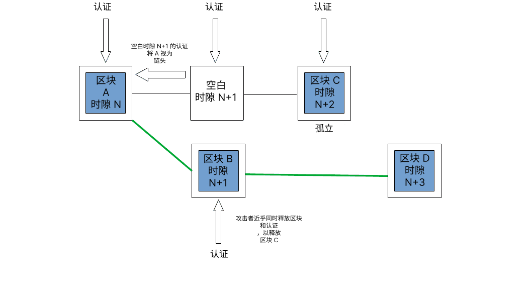 在首次描述低成本单区块重组攻击的同一篇论文中 (opens in a new tab),也描述了最终确定性延迟(又称为“活性失败”)攻击,这种攻击需要攻击者成为时段边界区块的提议者。 这非常重要,因为这些时段边界区块会成为检查点,以供 Casper 友好最终确定性工具 (FFG) 最终确定区块链的各个部分。 攻击者只需扣留它们的区块,直到足够多的诚实验证者使用它们的友好最终确定性工具 (FFG) 投票支持上一个时段边界区块作为当前最终确定的目标。 然后,攻击者释放扣留的区块。 攻击者证明它们扣留的区块,其余的诚实验证者也这样做,从而创建具有不同目标检查点的分叉。 如果攻击者准确把握时机,就能阻止最终确定性,因为任一分支都无法获得 2/3 绝对多数的证明。 质押越小,就越要精准地把握时机,因为攻击者直接控制的认证会更少,攻击者能够控制提议给定时段边界区块的验证者的几率就越低。